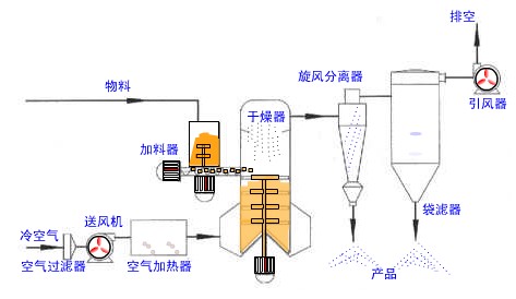 旋轉(zhuǎn)閃蒸干燥機(jī)的干燥系統(tǒng)主要由空氣過濾器、加熱器、加料器、熱風(fēng)分布器、閃蒸干燥主機(jī)、分級(jí)室、旋風(fēng)分離器、布袋除塵器以及引風(fēng)機(jī)等主要設(shè)備及附件構(gòu)成。