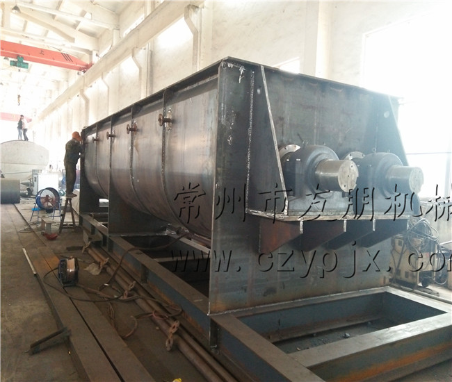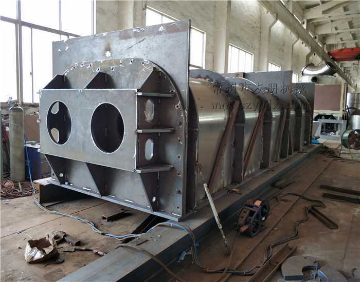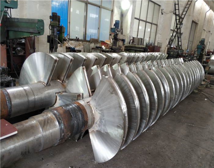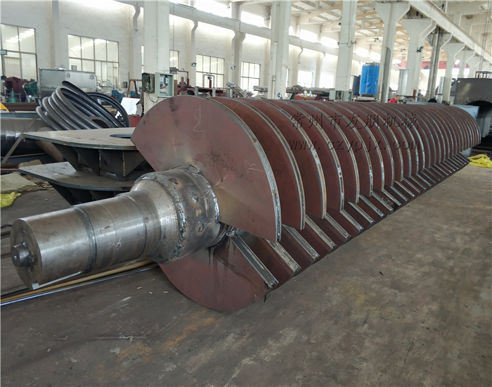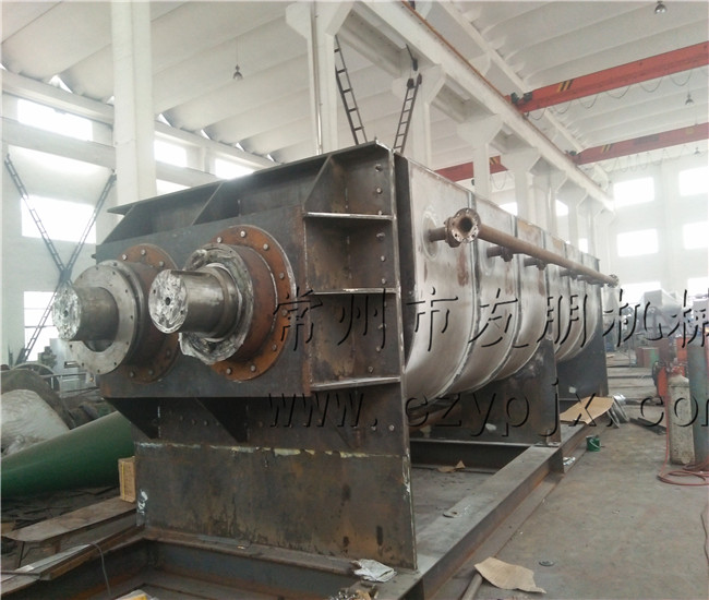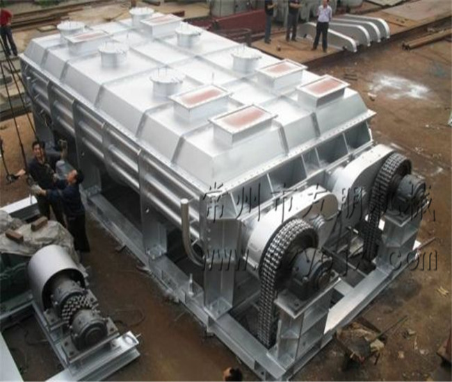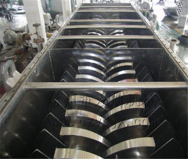 空心軸上密集排列著楔型中空漿葉,熱介質(zhì)經(jīng)空心軸流經(jīng)漿葉。單位有效容積內(nèi)傳熱面積很大,熱介質(zhì)溫度從-40℃到320℃,可以是水蒸汽,也可以是液體型:如熱水、導(dǎo)熱油等。間接傳導(dǎo)加熱,沒(méi)有攜帶空氣帶走熱量,熱量均用來(lái)加熱物料。熱量損失僅為通過(guò)器體保溫層向環(huán)境的散熱。楔型漿葉傳熱面具有自清潔功能。物料顆粒與楔型面的相對(duì)運(yùn)動(dòng)產(chǎn)生洗刷作用,能夠洗刷掉楔型面上附著物料,使運(yùn)轉(zhuǎn)中一直保持著清潔的傳熱面。漿葉干燥機(jī)的殼體為Ω型,殼體內(nèi)一般安排二到四根空心攪拌軸。殼體有密封端蓋與上蓋,防止物料粉塵外泄而充分發(fā)揮作用。